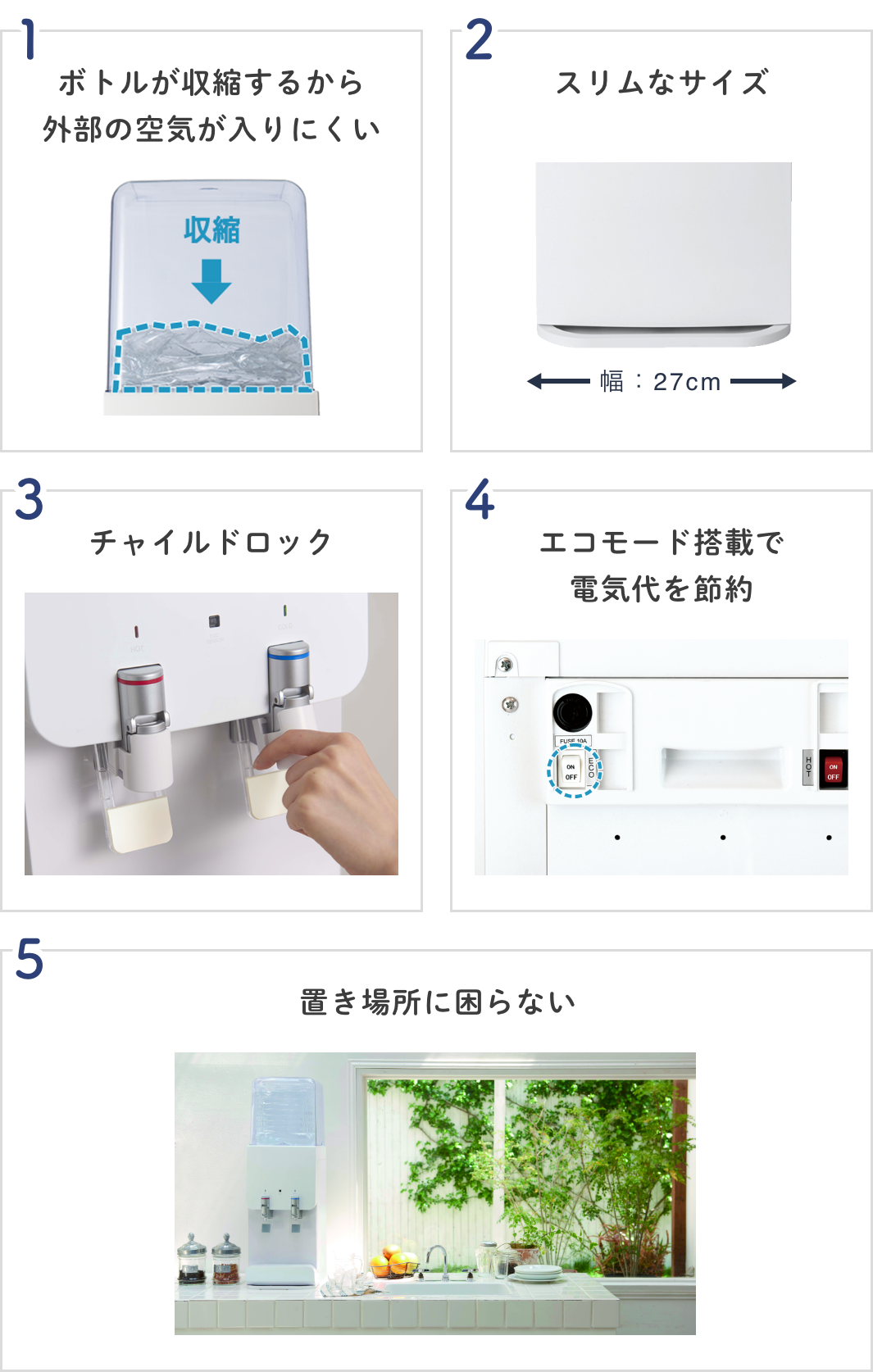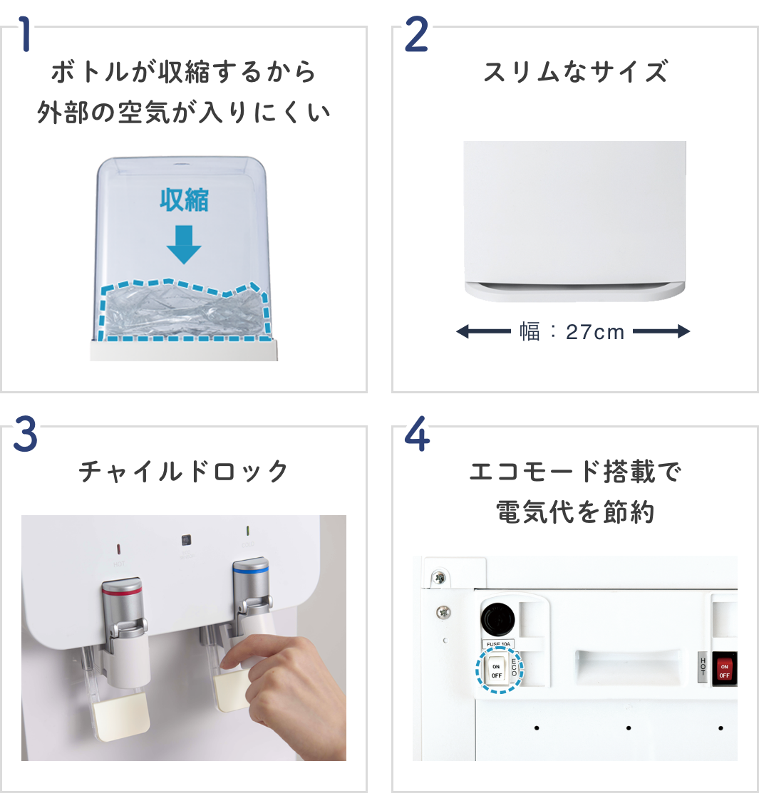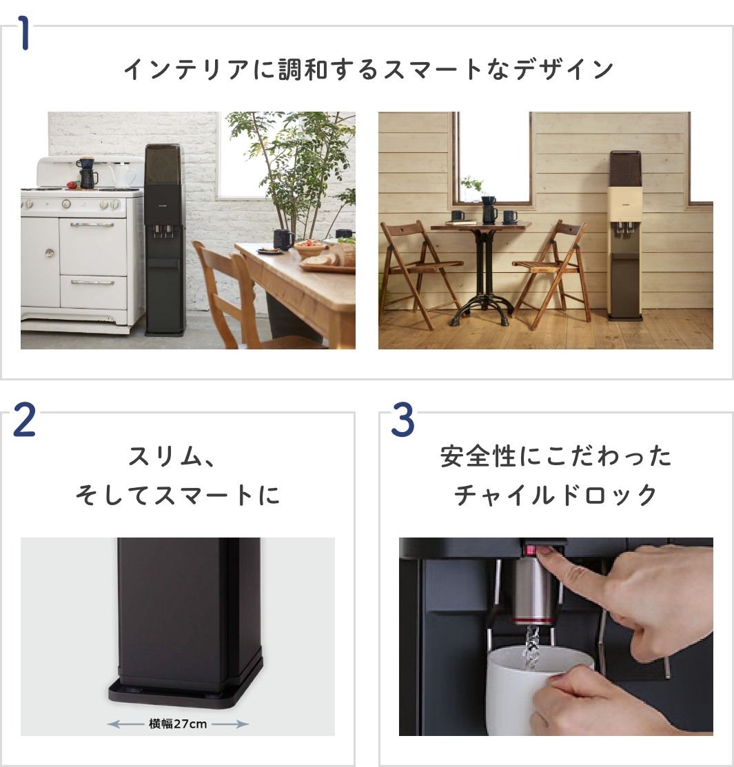 | 搭載機能 | – エコモード(ON/OFF 可能) – 冷温水コックチャイルドロック – 冷温水チャイルドロックボタンカバー – 温度過昇保護装置 – ダブルロックカバー |